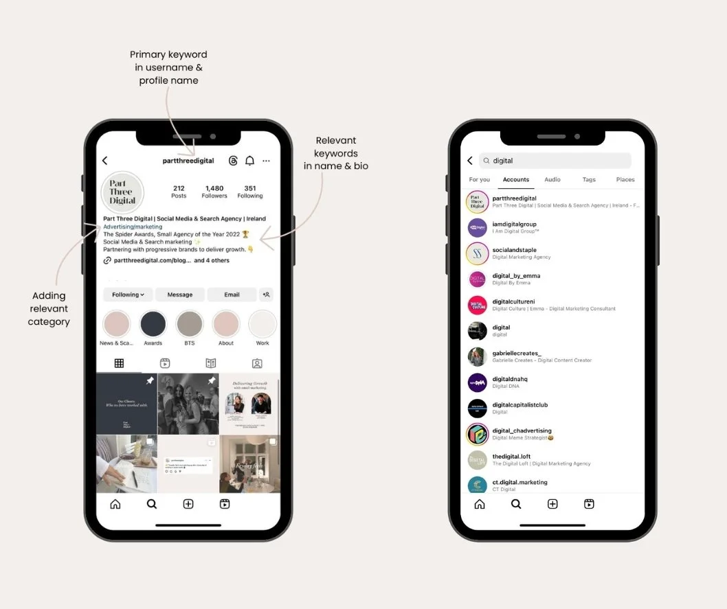 Your Instagram bio is a great way to organically integrate keywords into your profile. We have outlined ‘digital’ as our primary keyword and our secondary keywords as ‘social media’, ‘search’ and ‘marketing’ and all of these we incorporate throughout our content in hashtags and copy.