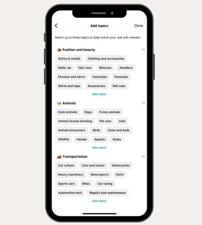 In addition to keywords and hashtags, Instagram has a secret gem; Topics. Topics can be used when uploading reels; the topics feature allows you to select up to 3 key topics that relate to your brand and reach audiences who share similar interests to your brand.